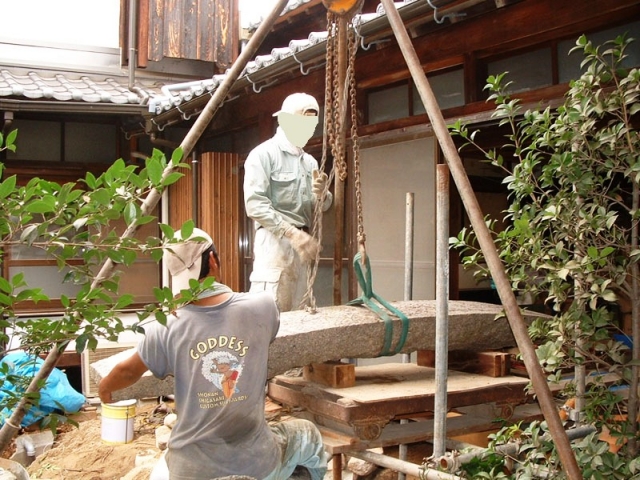 お寺にあった石橋、石臼、庭石等、室内を台車で中庭に運び入れ、チェンブロックで据付ました。